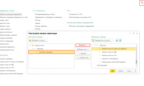 Если в разделе Отчеты у вас Экспресс-проверки нет, добавьте отчет по кнопке Настройки панели навигации, как показано на рисунке.