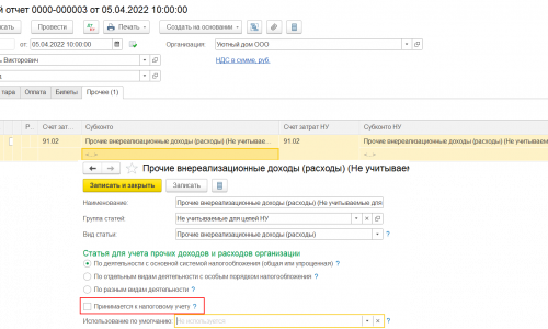 Добрый день! Организация на ОСНО приобретала на корпоратив угощения и цветы, оплата осуществлялась через корпоративную карту, привязанную к расчетному счету. Подотчетное лицо предоставил кассовый и товарный чек. Оформляем авансовый отчет. Подскажите пожалуйста, как занести расходы, чтобы они не принимались в расходы по НУ? Выбираю прочие расходы, не принимаемые в НУ (без галочки), но по движению документа вижу, что в НУ тоже расходы попадают. Помогите пожалуйста.