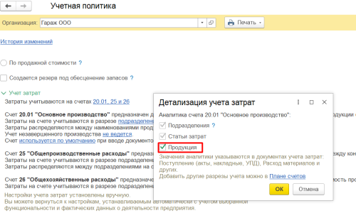 Если в Детализации учета затрат галочкой отмечена Продукция,
