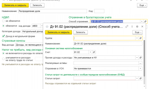 Начисление дохода при распределении доли оставшемуся участнику отразите проводкой Дт 91.02 Субконто Не принимаемые в НУ Кт 70. Для этого в созданном Начислении в поле Способ отражения выберите отражение на счете 91.02. Смотрите прикрепленный файл. После начисления зарплаты оформите документ Операция, введенная вручную проводки: