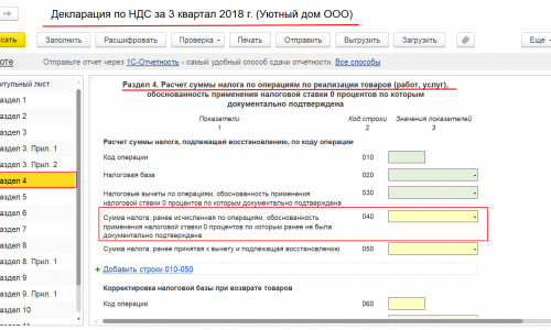 В строке 040 Сумма налога, ранее исчисленная по операциям, обоснованность применения налоговой ставки 0 % по которым ранее не была документально подтверждена Раздела 4 отражается сумма НДС, начисленная ранее по ставке 18% по неподтвержденному экспорту, которая принимается к вычету при его подтверждении. Данное поле заполняется вручную.