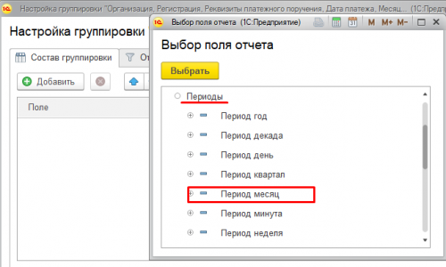 Вячеслав, сложные поля через «.», например, Период.Месяц — означают, что нужно войти в Период, нажать на «+» слева у поля и выбрать внутреннее поле Месяц из раскрывшегося списка.