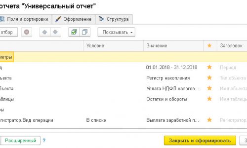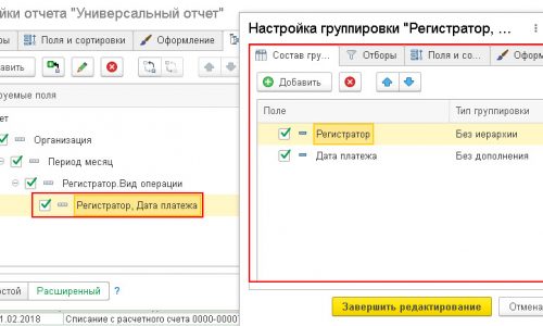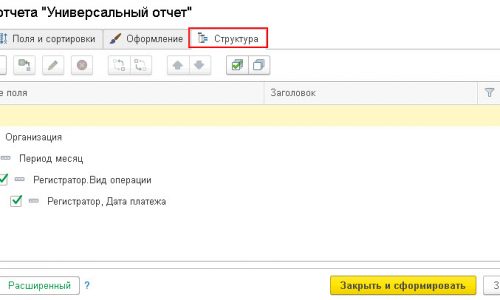 Ирина, что-то у меня получается не очень-то: при создании Унив. отчета не смог найти двух полей в структуре: Период месяц и Регистратор, Дата платежа. Отчет получился «кривой» — данных никаких не вывалилось