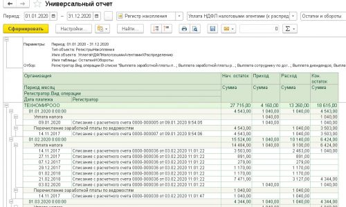 Регистр Уплата НДФЛ налогового агента — регистр остатков, это значит, что в него делаются записи и в «+» и в «-«.