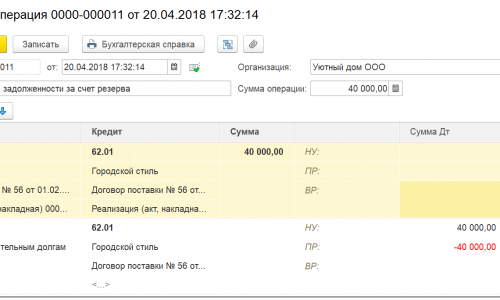 Добрый день, резервы по сомнительным долгам наша организация создает только в бухгалтерском учете. Как рекомендовали на одном из семинаров в программе 1С (8.3) в данном случае в разделах «Учетная политика» и налог на прибыль автоматическое формирование резервов по сомнительным долгам не выбрано. Резерв сформировали на 31.12.2017г. оформили операцией введенной вручную. Проводка Д-т.91.2 К-т. 63 Вид расхода «Резервы по сомнительным долгам — «Принимается к НУ» не отметили».