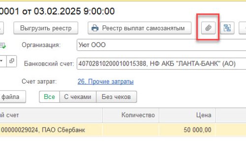 Если вы получаете чеки напрямую от самозанятых, загрузить их можно в документе Выплаты самозанятым по ссылке Загрузить в графе Чек самозанятого.