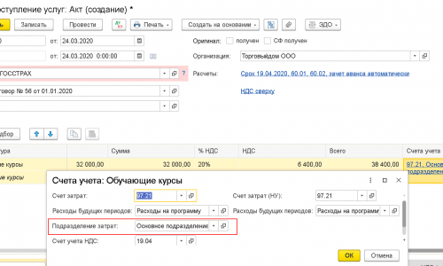 Добрый день! Ведем учет в БП 3.0 . В феврале 2020 года принимали к учету затраты на сч. 97.21 в НУ и в БУ 08.11. Все вставало нормально по подразделениям . Сейчас перепровожу документы почему то подразделение уходит. В чем может быть причина?