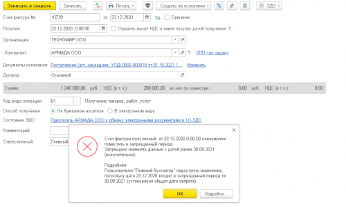 Заношу в 1С пропущенный документ 2020 года от поставщика (через счет 91,2). Номер и дату ставлю как в УПД, а дату поступления — 4 кв. 2021г. Но при занесении счет-фактуры программа ругается на закрытый период (2020г). Как быть в такой ситуации? Скрины прилагаю.