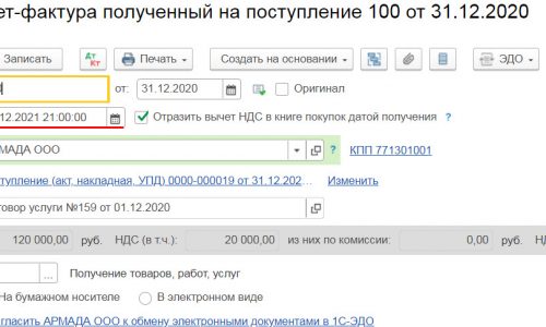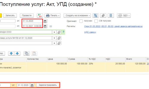 Услуги акт и СФ от 31.12.2020 №100 на 120 000 в т.ч. НДС 20% получили 31.12.2021.