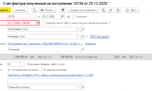 Добрый день! Да, я вижу в вашем примере, как занесены даты в счет-фактуре. Но у меня при заведении счета-фактуры только номер и дата, я же не могу поставить дату счета-фактуры текущего года?