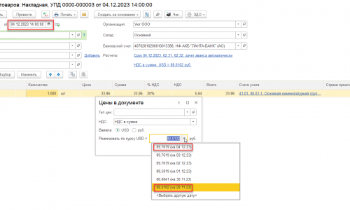 2. Мы меняем курс в отгрузке на курс по дате предоплаты, нажимаем «ОК», потом снова открываем, а там все равно стоит курс на дату реализации. Надо поменять каким-то другим способом. Мы меняем в «Цены в документе».