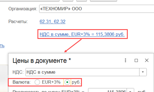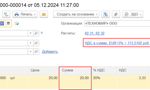 5. На основании счета создаем документ Реализация (акт, накладная), меняем договор на договор в Евро+3%, вручную меняем цену в Евро в акте на ту, которая указана в счете, затем в строке НДС (гиперссылка) меняем валюту на рубли, нажимаем Ок. Акт заполняется в рублях по курсу Евро+3%.