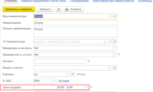 1. В справочнике Номенклатура у реализуемой услуги устанавливаем цену в Евро.