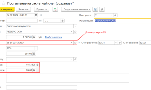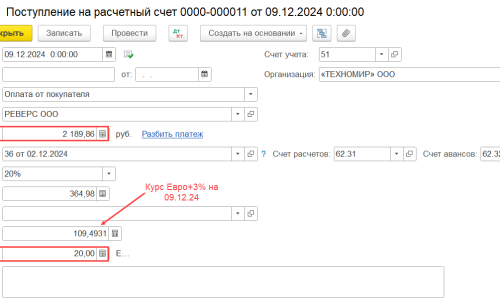 6. Создаем документ Поступление на расчетный счет, договор устанавливаем Евро+3%. Сумма оплаты в рублях должна соответствовать сумме в Акте.