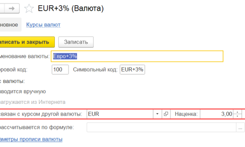 2. В справочнике Валюты создаем валюту Евро+3%.