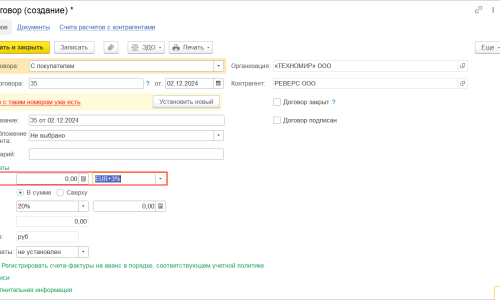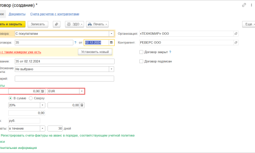 3. Создаем два договора с одинаковым номером и датой (программа выдаст предупреждение — можно игнорировать) один договор в Евро, оплата в рублях, второй договор в Евро+3%, оплата в рублях.