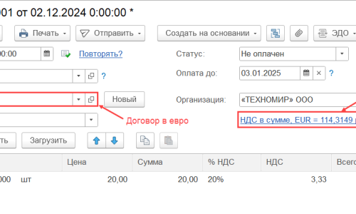 4. Выписываем счет в Евро, договор указываем в Евро.