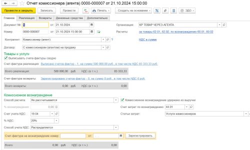 Но это в любом случае будет не полный отчет: мы сможем здесь увидеть только реализации, товары, СФ на вознаграждение, но полученные СФ и выставленные потребуют полноценного отчета в СКД (Системе компоновки данных).