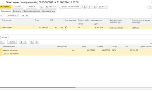Добрый день! Мы работаем не с товарами, а с услугами. Отчеты комиссионерам создаются в не зависимо от каких либо документов. В отчете в кладке Реализация я вношу № полученной счет.ф. и дату, затем при сохранение присваивается № выставленной комиссионеру счет. ф. вот об этик номерах шла речь.