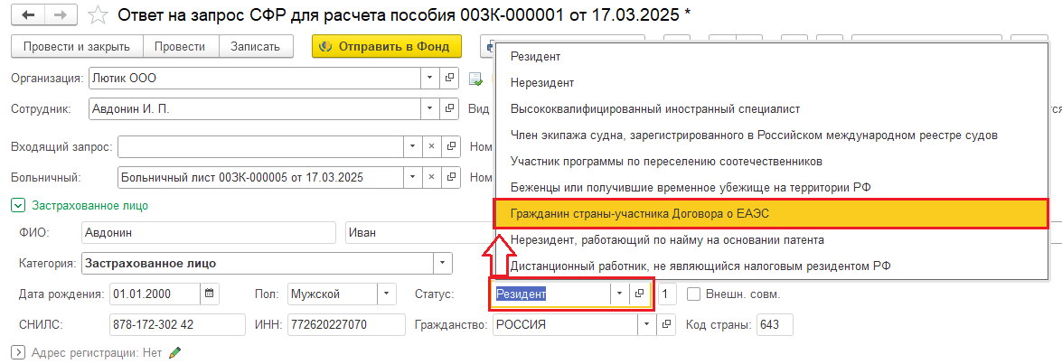 Ответ на извещение: там есть уточнить личные данные сотрудника в больничном. Нажимаю, открывается больничный и там в налогов статусе нет Гражданин страны-участника Договора о ЕАЭС. Есть только что во вложении. Что поставить? 1 вариант?