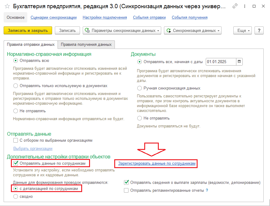 Добрый день! Проверьте, пожалуйста, в настройках синхронизации в ЗУП, проставлены ли галочки: