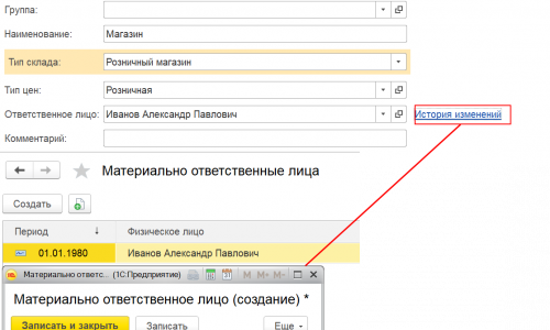 Раздел Справочники — Товары и услуги — Склады. Выбираете склад в поле Ответственное лицо по кнопке — История изменения в открывшемся окне указываете новое МОЛ и дату с которой будет действовать