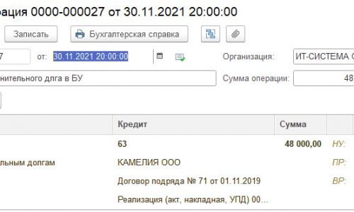 Простой пример: Организация создала резерв только в БУ в сумме 48 000 руб. Создание резерва — Операция (рис. 1). Обратите внимание, начислять ОНА не надо. Программа сама это это сделает регламентной операцией Расчет отложенного налога по ПБУ 18.