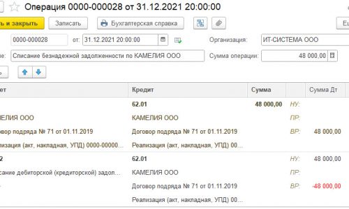5. Списание безнадежной задолженности произодится двумя проводками, для БУ и НУ отдельно. Погашение ОНА также не производим вручную (рис.)