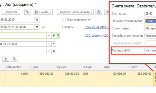 Обратите внимание я указала что Расходы (НУ) — Не принимается — это нужно указать , для того, чтобы услуги тоже сразу не попали в КУДиР, а только после ввода в эксплуатацию ОС. Аналогично в поле Расходы (НУ) — Не принимается, вы должны поставить в документе оприходования материалов , для того, чтобы у вас материалы сразу не попадали в КУДиР — поправьте это на входе.