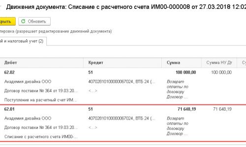 Но у вас есть еще возвратная сумма 71 648,19, которую вы должны выплатить по договору заказчику, чтобы закрыть работы, которую вы ранее выплачивали за возвратные материалы. В этот раз у вас возвратных материалов нет. И задолженности поставщиком нет, судя по использованию в прошлый раз счета 60.01