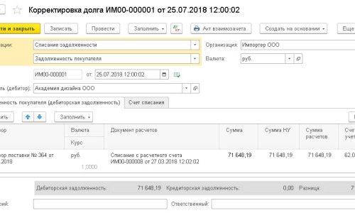 2 делаю корректировка долга (Вид операции — Списание задолженности — Списать — Авансы покупателя.) на сумму 71 648,19 — эта операция дает проводки — Д 76,06 К 91,02