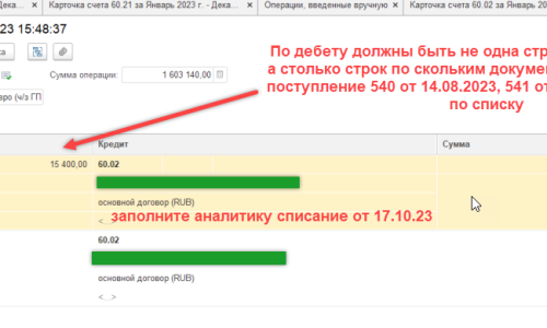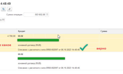 — Операцию от 17.10.23 нельзя делать одной суммой и не заполнять аналитику документ расчетов, т.е. у вас должно быть столько строк в операции сколько документов вы зачитываете.