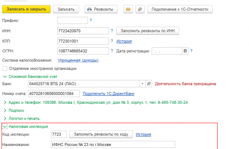 Если вы меняли юридический адрес и ИФНС, лучше воспользоваться кнопкой Поставить на учет по новому адресу — это помощник, который позволяет отразить снятие организации с учета по текущему адресу и постановку на учет по новому адресу. Кнопка Поставить на учет по новому адресу находится в карточке Организации по гиперссылке Адрес и телефон.