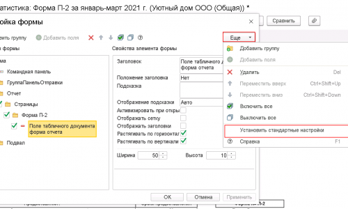 У меня форма настройки заполнения данного отчета не соответсвтует стандартному. Как настройку вернуть к стандартному заполнению