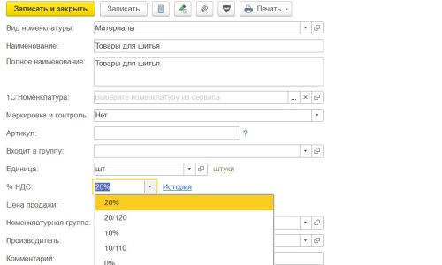 Я попробовала создать новую номенклатуру в справочнике Номенклатура. В поле «%НДС» предлагается старая ставка 20%, а не новая 20% (5%, 7% при УСН) (мы все еще работаем на релизе 3.0.168.19)
