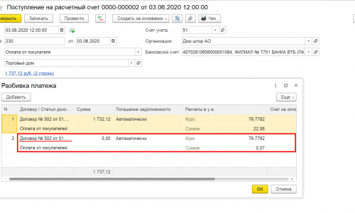 2. В документе Поступление на расчетный по кнопке Разбить платеж на две суммы: