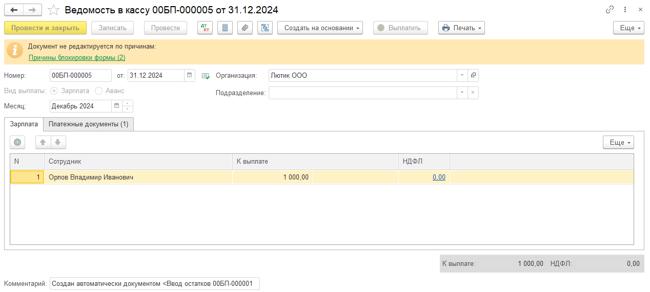 Протестировала механизм ввода остатков, он нормально отрабатывает только по старой схеме, т.к. ведомость на выплату формируется техническая без возможности ввести НДФЛ.