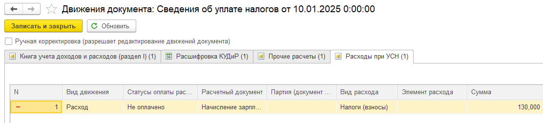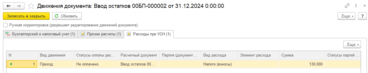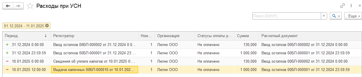 ну смотрите, в принципе я думаю у нас в регистре Расходы при УСН должно быть все корректно. Так как у нас в 2024 году были УСН доходы. С 2024 по 2025 делали документ Ввод остатков автоматически типовыми средствами и вся зп за декабрь 2024 при выплате 10.01.2025 не принимается в расходах УСН.