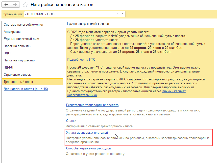 1. Попробуйте зайти в Главное -> Настройки -> Налоги и отчеты -> Транспортный налог -> Уплата авансовых платежей (прилагаю картинку). Там поставить все отметки.