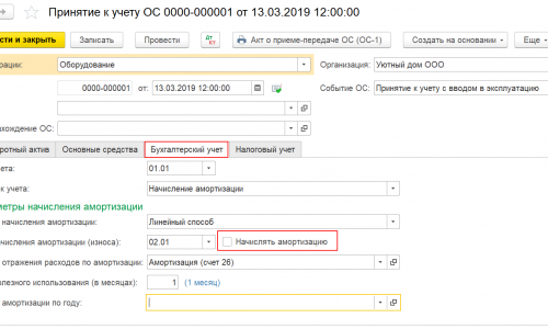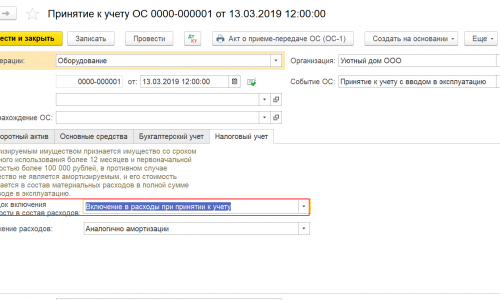На вкладке Налоговый учет в поле Порядок включения в состав расходов укажите — Включение в расходы при принятии к учету