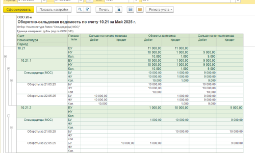 — формируем ОСВ по счету 10.21, вся сумма 10 000р. отражена по спецодежде