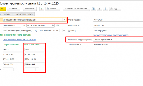 Документ Корректировка поступления вид операции Исправление собственной ошибки в 1С