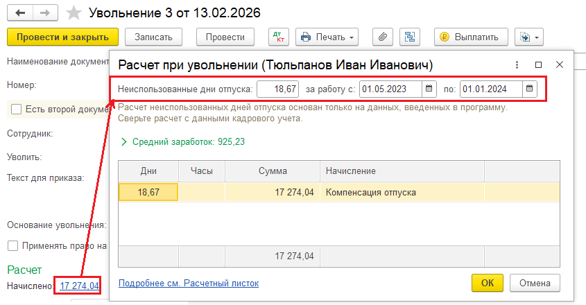 Добрый день! В Бухгалтерии автоматизирован упрощенный расчет остатков отпусков в документе Увольнение:
