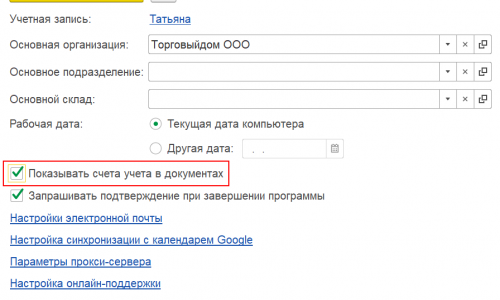 Для того, что бы счета отражались в документах необходимо в раздел Главное — Настройки — Персональные настройки поставить флажок Показывать счета учета в документах.