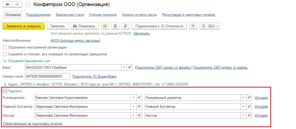 Для подписания отчетов и документов ФИО и должность указывать в разделе Главное — Организации в карточке организации в подразделе Подписи: