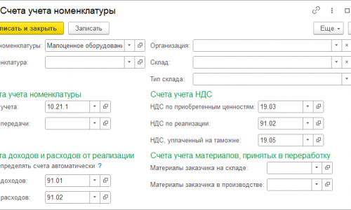 Кажется, я нашла. Посмотрите приложенный скрин — возможно, дело было в том, что не были прописаны счета учета номенклатуры для Малоценное оборудование и запасы. Подразделение одно, поэтому там пустое поле.