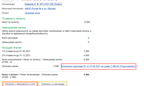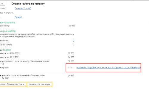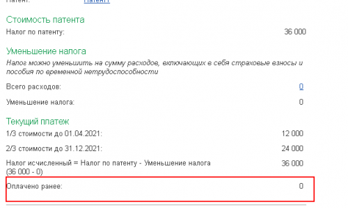 Добрый день! ИП оплатил 1/3 патентного налога 19.02.2021. Банковская выписка разнесена, в оборотно-сальдовой ведомости образовалось дебетовое сальдо по счету 68.14 на сумму уплаты патентного налога. Я правильно понимаю, что в Помощнике уплаты ПСН в строке “Оплачено ранее” сумма уплаченного налога должна быть? Что мне нужно сделать, чтобы я видела эту сумму в Помощнике в строке “Оплачено ранее”? У меня вся сумма налога отражается в строке “Налог к уплате”. Спасибо.
