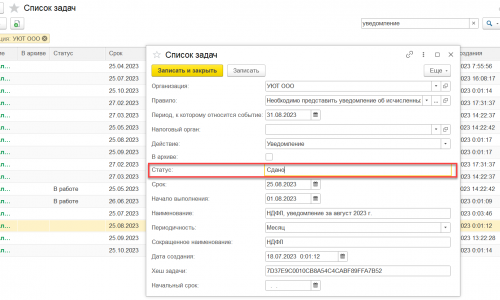 Найдите в списке нужную задачу в вашем случае это НДФЛ, уведомление и Страховые взносы, уведомление за август 2023 г.