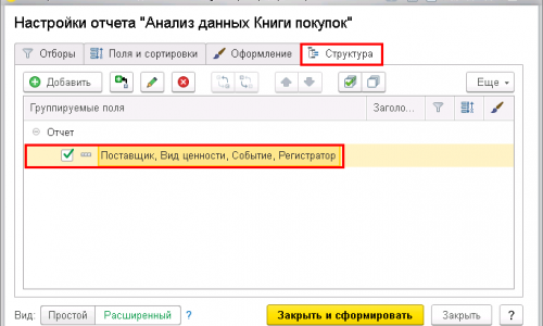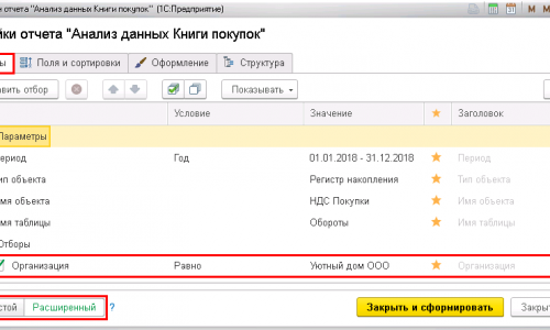 Теперь по настройкам. Период и регистр накопления выставляем как нашей статье по старому формату. Далее — кнопка Настройки. Вид — Расширенный