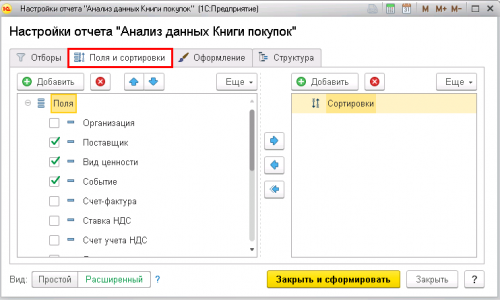 Вкладка Поля и сортировки. Убрать лишние поля, оставить те, что перечислены в статье: